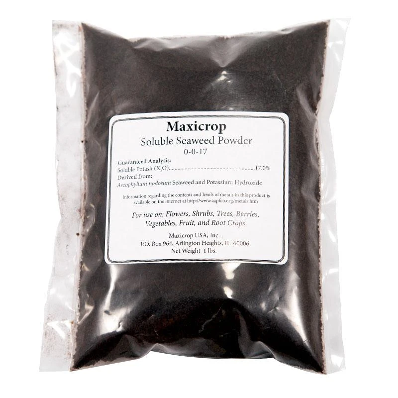 1 lb of Maxicrop is created from over 200 lb of seaweed. Maxicrop is sought after primarily for its trace elements but also has an analysis of 0% N, 0% P, 17% K.